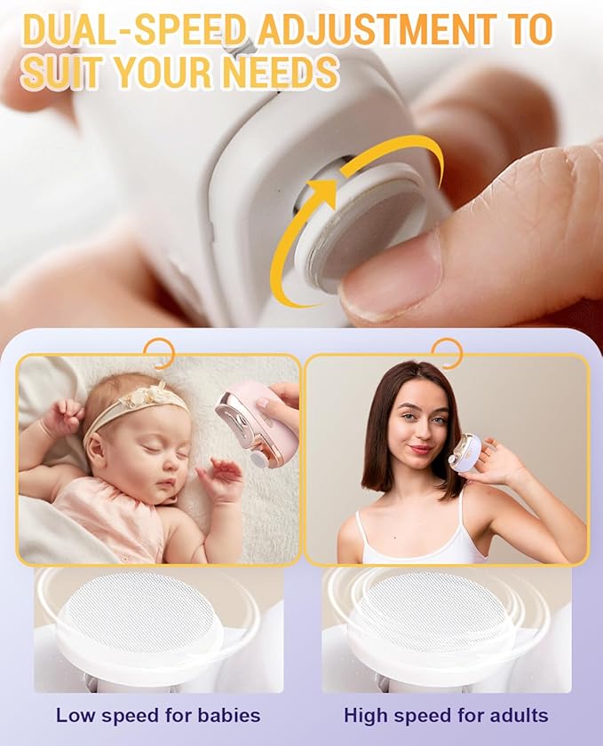 • 2-Speed Safety Nail Clipper: The blades of this electric nail clipper have a built-in design that won't endanger fingers when your nails are inserted into the grooves. The electric nail clipper is suitable for babies, kids, seniors, and adults, it boasts 2-speed levels, and you can switch comfortably between low and high-speed modes
