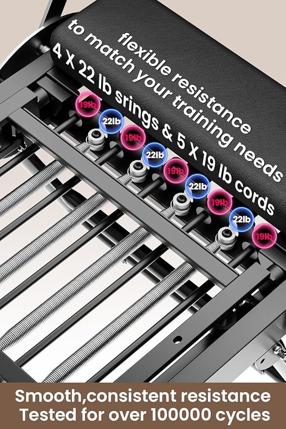 • 【Fully Adjustable to Match Your Pace】Customize your workout with 4 springs (22 lb each) and 5 resistance cords (19 lb each), providing a total resistance of up to 182 lbs (82.5 kg). You can easily adapt the resistance to suit your training goals. The foot bar offers four angle settings, and the silent pulley system features three adjustable heights—giving you full control over every session.