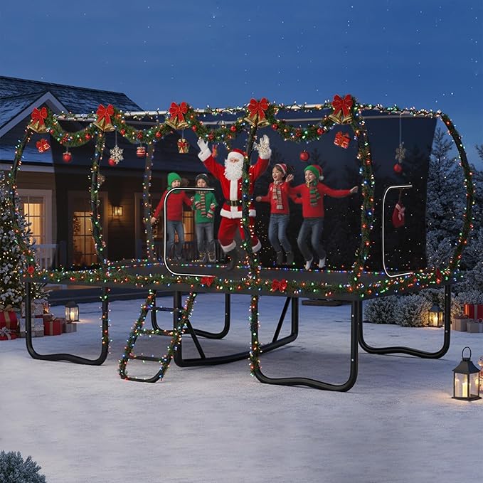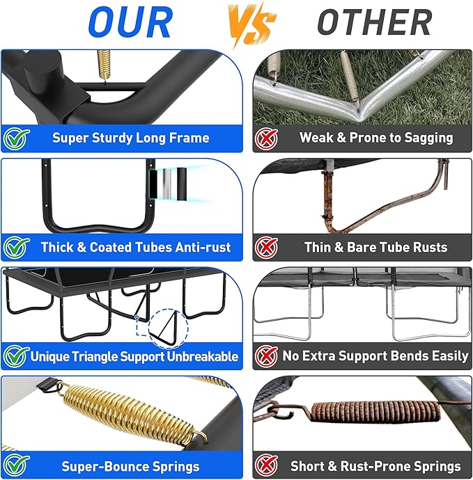 • 【Every Detail Defines Quality】Built with a 61 mm-diameter, 2 mm-thick galvanized steel frame, the rectangular trampoline delivers unmatched durability. 6.5-inch anti-rust springs and a high-density, anti-UV PP jumping mat create a powerful yet stable bounce. The tightly woven enclosure net with reflective strips ensures visibility and safety—making this large heavy-duty trampoline not just strong but stylish, shining like string lights under the sun.