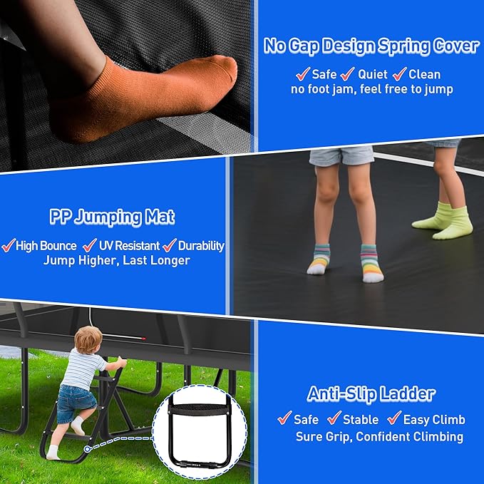 • 【Secure & Easy Access with No-Gap Design】This rectangular trampoline outdoor features two C-shaped zippered doors for easy entry and accessory setup. The No-Gap Design spring cover prevents pinched feet during jumps. Comes with an anti-slip ladder, allowing all ages to enjoy safe, effortless access. The trampoline rectangle with enclosure provides a secure space for flips, gymnastics, and tumbling trampoline fun—ideal for energetic kids and sporty adults alike.